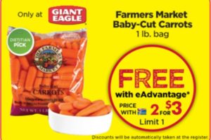 To get a FREE 1 lb. Bag of Farmers Market Baby-Cut Carrots at Giant Eagle load a coupon to your Advantage card. Expires 10/5. Find a location near you!